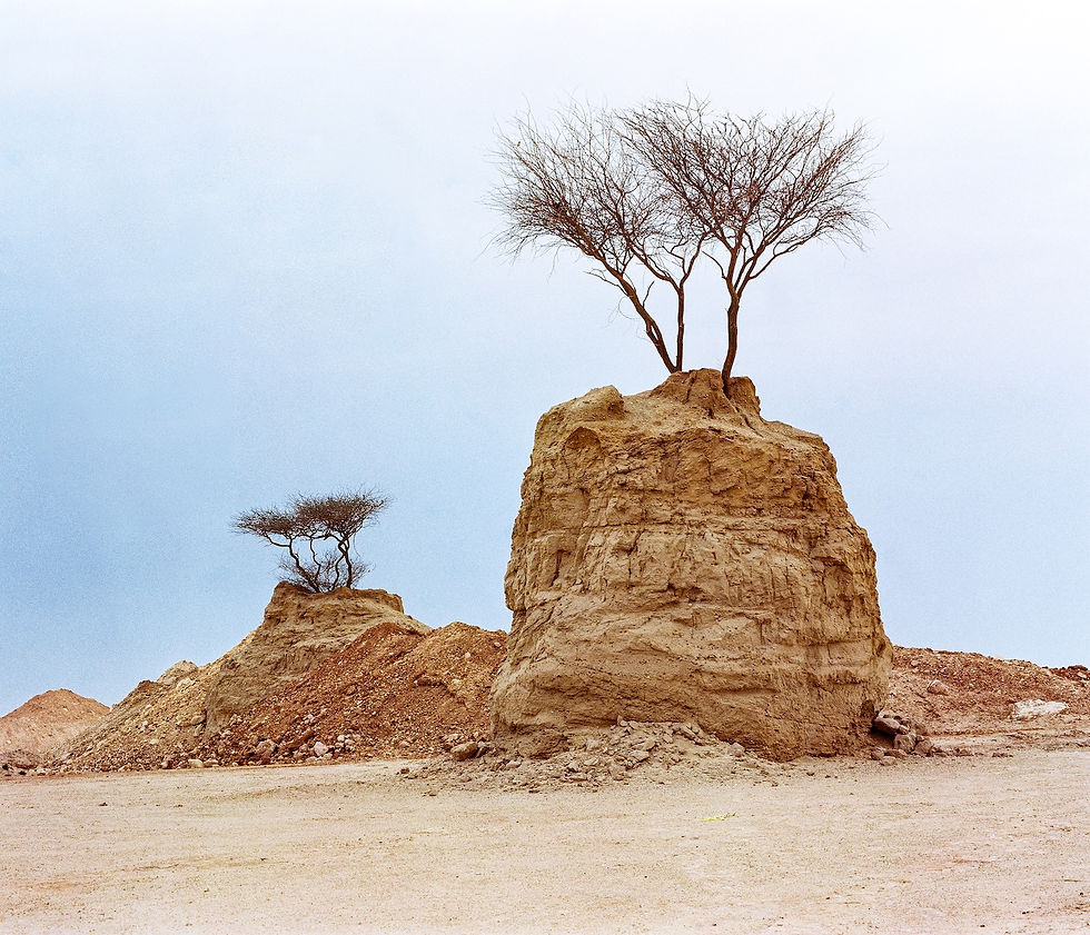 Listed as a tourist attraction in Google Maps, Umm Bab Clay Quarry is in fact a fully operational industrial extraction zone. Located in western Qatar, the area is home to several unique and striking landforms. While they may appear to be natural phenomena, these tree topped clay columns are actually remnants of the clay extraction process. For reasons which remain unclear, excavators in the area have for decades dug around existing trees, leaving a stark and visible record of the scale of man made change to this desert landscape.